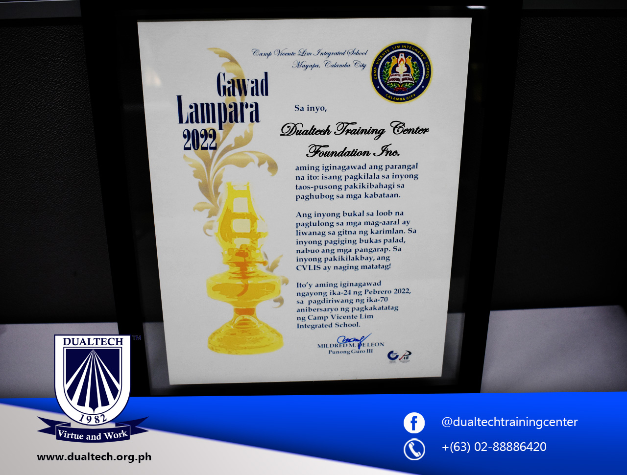 On its 70th Founding Anniversary, Camp Vicente Lim Integrated School awarded Dualtech Center the GAWAD LAMPARA 2022 for its partnership in the immersion program for the senior high school students.
