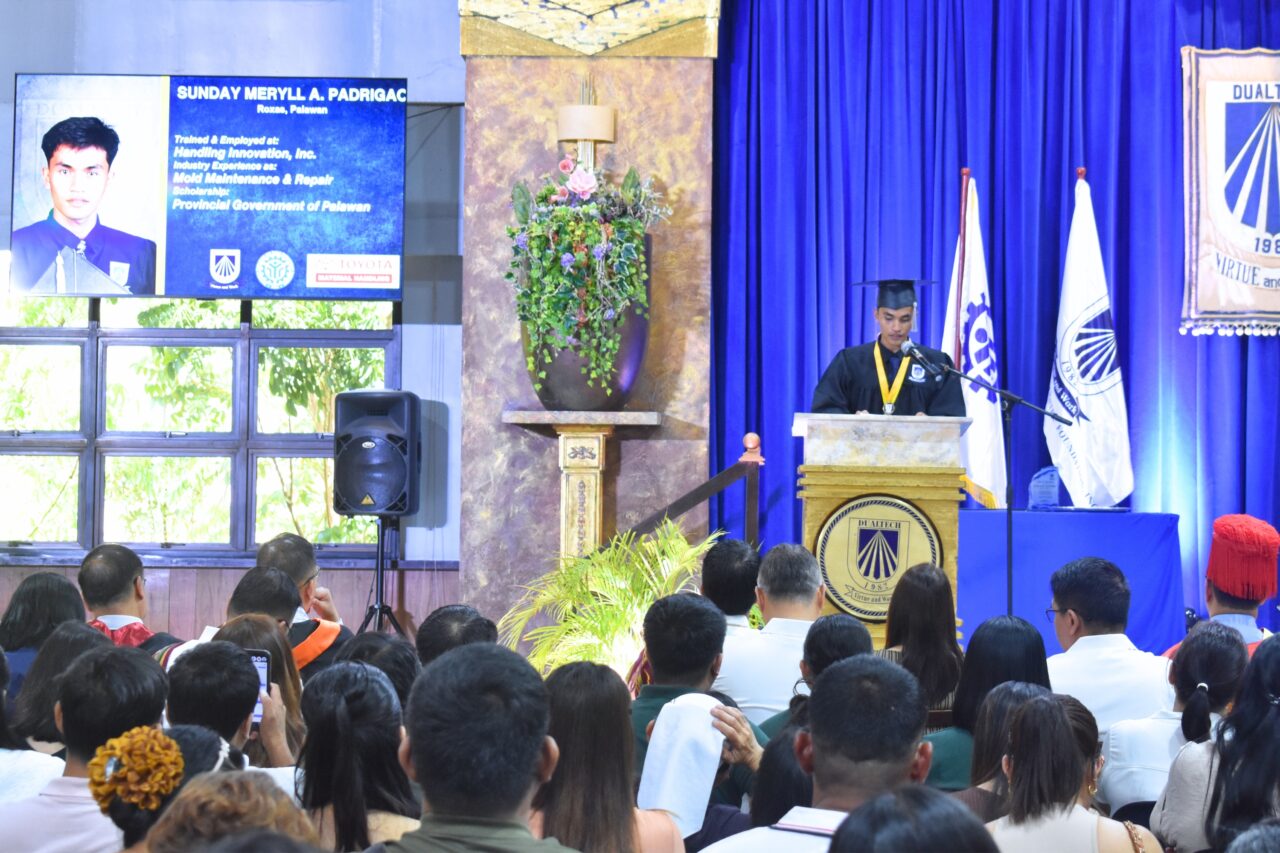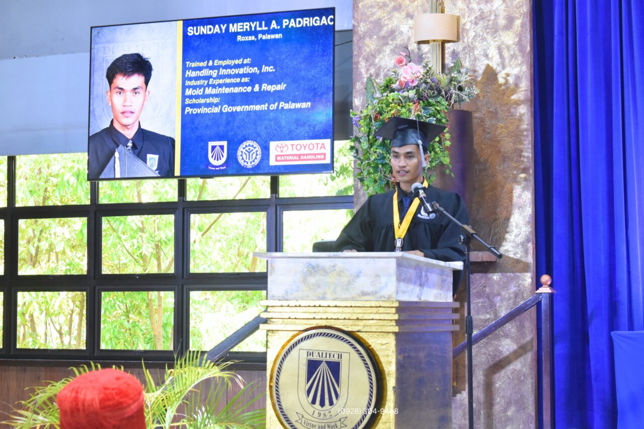 Batch Representative Sunday Meryll Padrigao from Roxas, Palawan delivered a message on discipline, responsibility, and personal growth during the commencement exercises at Dualtech Training Center.